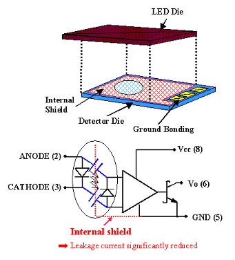 因此,设计人员使用屏蔽技术,最大限度地降低泄漏电流,使剩余的泄漏电流从输出IC的关键节点分流出去,特别是光电探测器区域。光电耦合器的屏蔽性能对整体抗CMR能力至关重要。安捷伦采用专有屏蔽技术,提供了高达15 kV/μs的CMR性能 (图1)。通过优化输入电路,如把LED偏置电阻器分开,使用不要求上拉电阻器的低阻抗输出阶段,可以进一步改善性能。